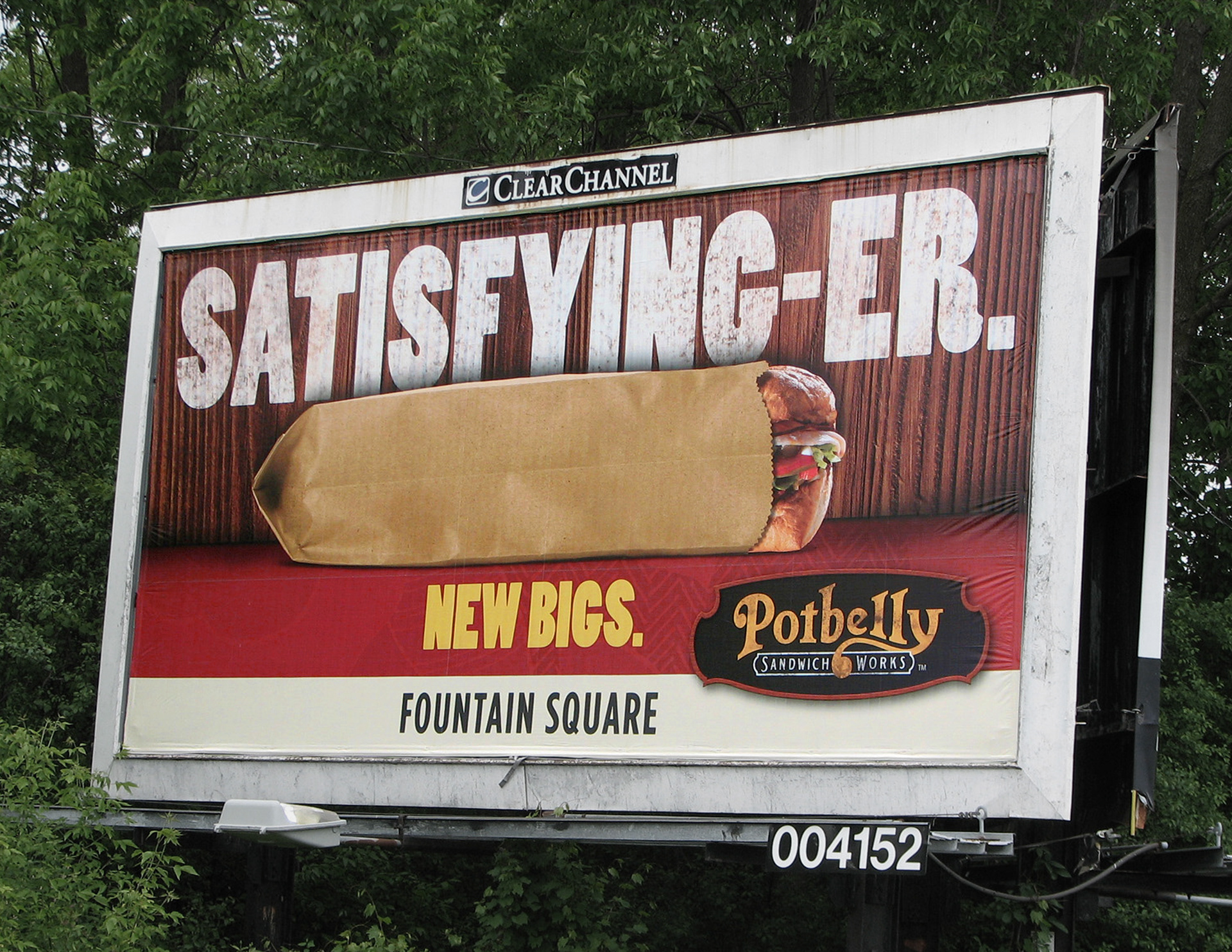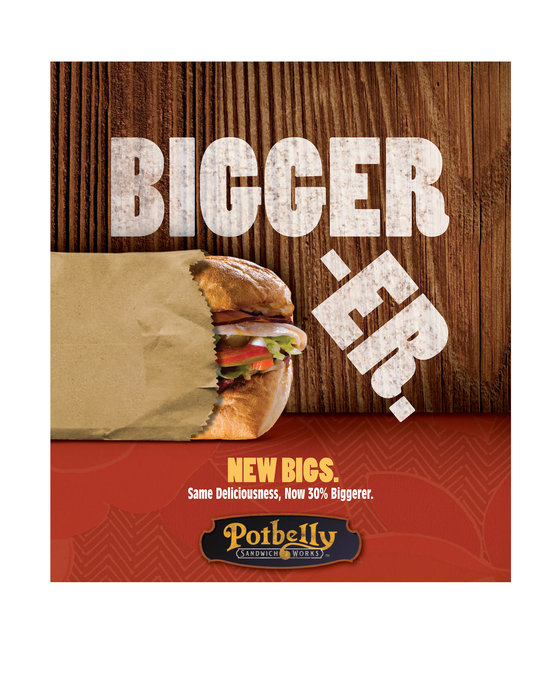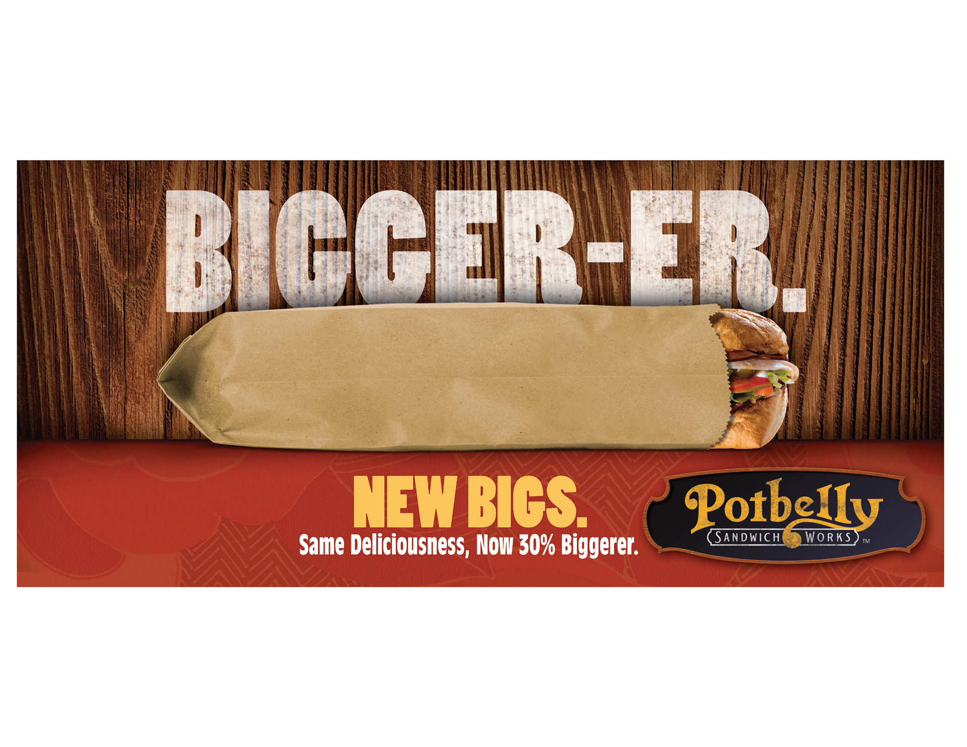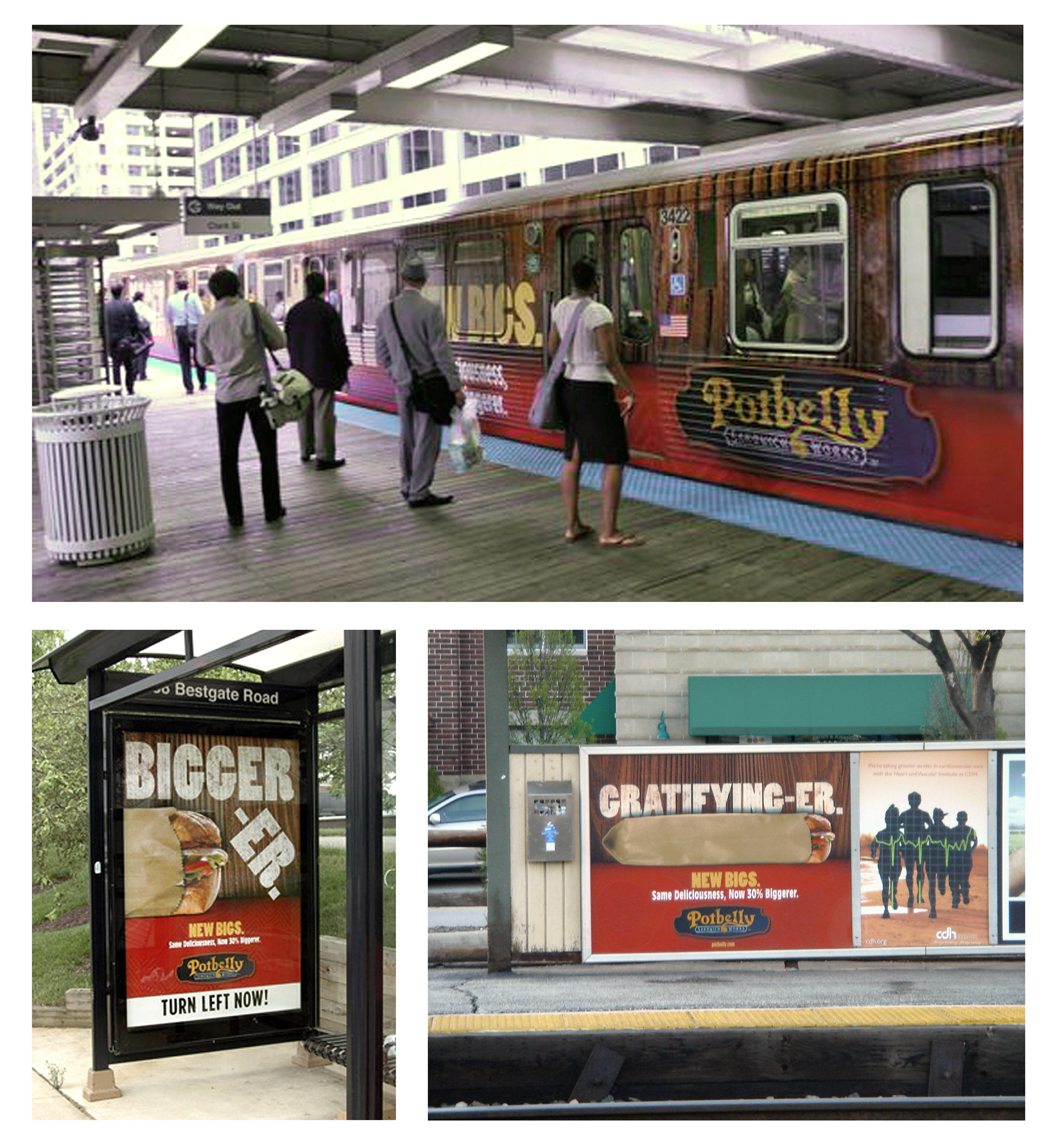 Potbelly Sandwiches launched a new, bigger sandwich, and needed ads to show just how big. Public transportation signs were aimed at college students and other hungry people on the go in Chicago, Texas and DC.